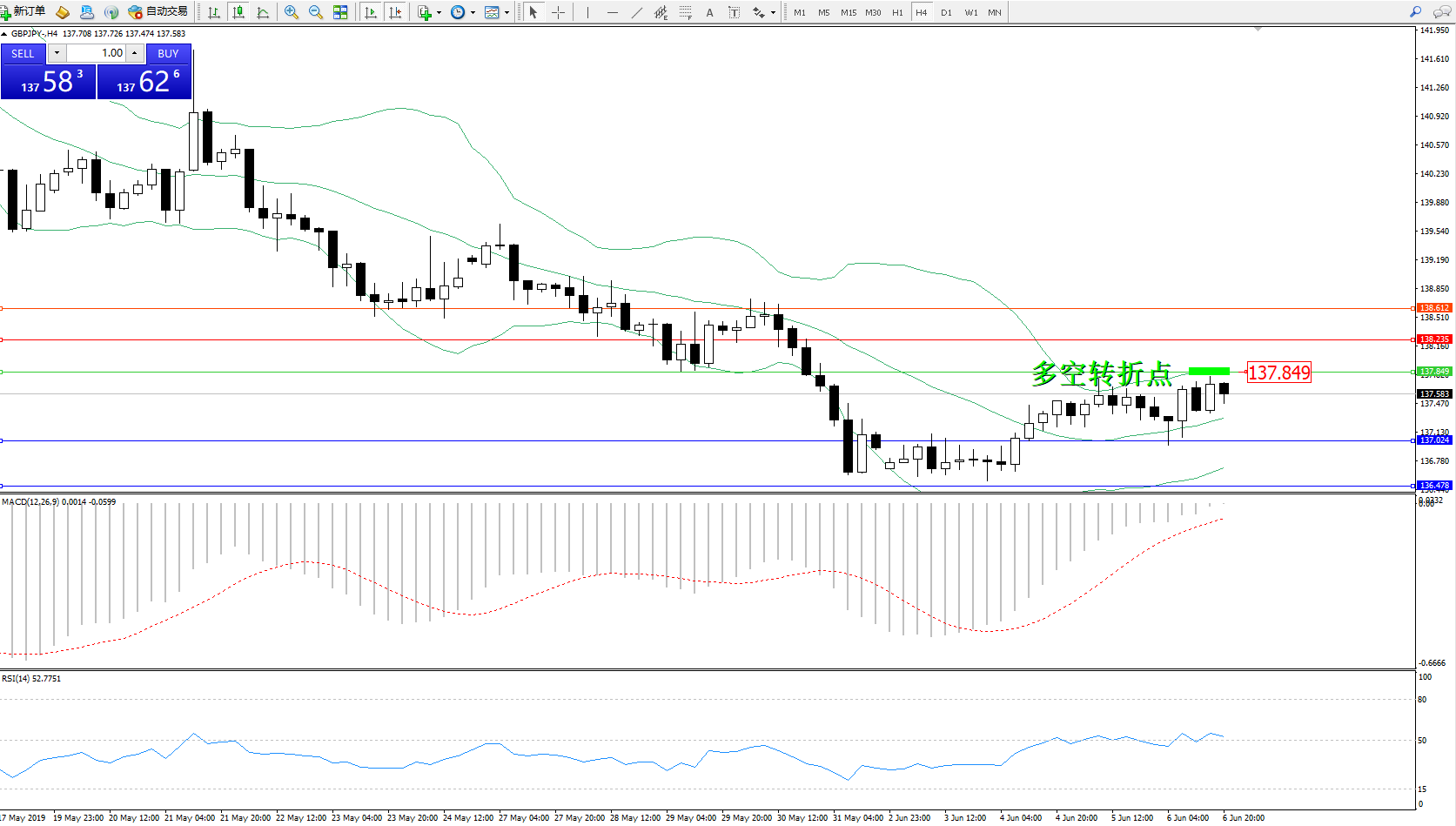 备选策略:137.849上方看涨,目标138.235、138.612