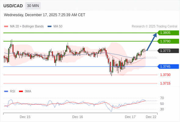 在 1.3745 之上,看涨,目标价位为 1.3790 ,然后为 1.3805 。