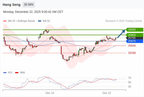恒生指数 当日内: 在25670之上,看涨。