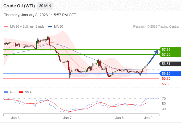 在 56.10 之上,看涨,目标价位为 57.50 ,然后为 57.85 。