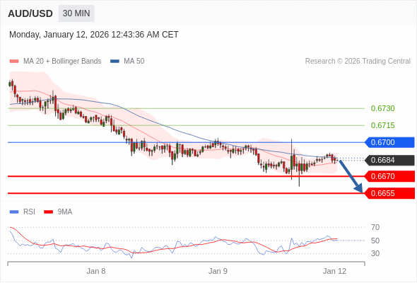 在 0.6700 之下,看跌,目标价位为 0.6670 ,然后为 0.6655 。