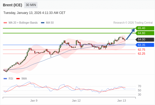 在 63.35 之上,看涨,目标价位为 64.80 ,然后为 65.40 。