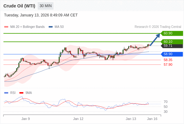 在 58.90 之上,看涨,目标价位为 60.10 ,然后为 60.90 。
