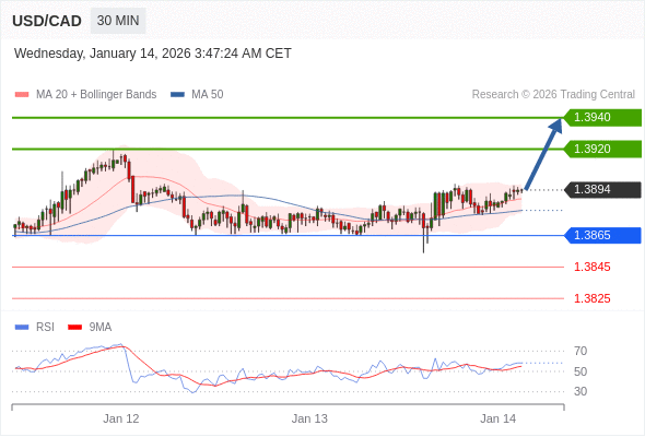 在 1.3865 之上,看涨,目标价位为 1.3920 ,然后为 1.3940 。