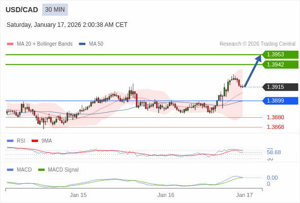 美元/加元 当日内 : 看涨,当 1.3899 为支撑位。