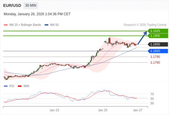 在 1.1820 之上,看涨,目标价位为 1.1900 ,然后为 1.1925 。