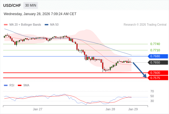 在 0.7680 之下,看跌,目标价位为 0.7600 ,然后为 0.7575 。