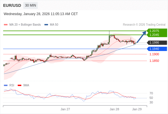 欧元/美元 当日内: 在1.1940之上,看涨。
