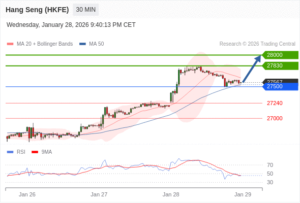 香港恒生指数期货 当日内: 超短线(当日内)支撑位在27500附近。