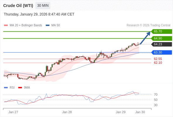 在 63.30 之上,看涨,目标价位为 64.90 ,然后为 65.70 。