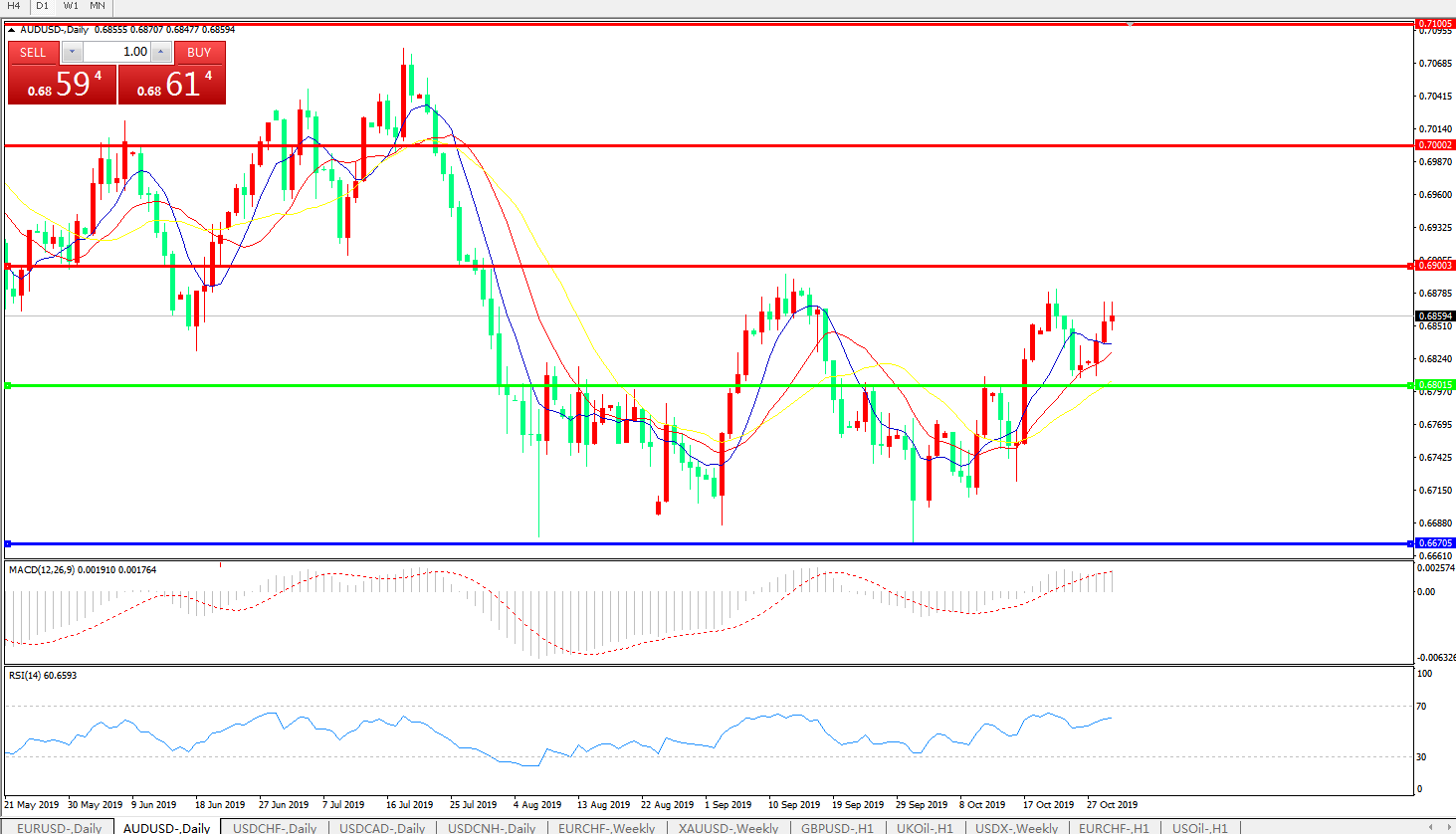 澳元兑美元在周二日内震荡走高,纽约时段开盘前触及上周二以来新高0.6861,主要是受到了全球贸易消息本周以来持续趋向乐观的带动,因为贸易对于澳洲这样的经济体而言尤为重要; 不过,澳元兑美元涨势仍然受到美元指数表现强劲的压制。一方面贸易向好同样提振了美元指数本身,另一方面,虽然美联储在周三再度降息已成定局,但是市场却提前开始押注其会在此后暂缓宽松脚步,这反而令美元得到提振。因此,澳元兑美元日内并未能一鼓作气强势单边上行;l 从趋势上来看,澳元兑美元也仍处于漫长的筑底过程中,上周高点0.68839月中旬的高点0.6895仍然是强势的趋势阻力,升破后站上0.69关口,方可确认上行趋势的延续。但这在本周三美联储决议直至下周二澳洲联储决议之前,难度仍然相当大。短期内,澳元兑美元仍将维持横盘波动走势