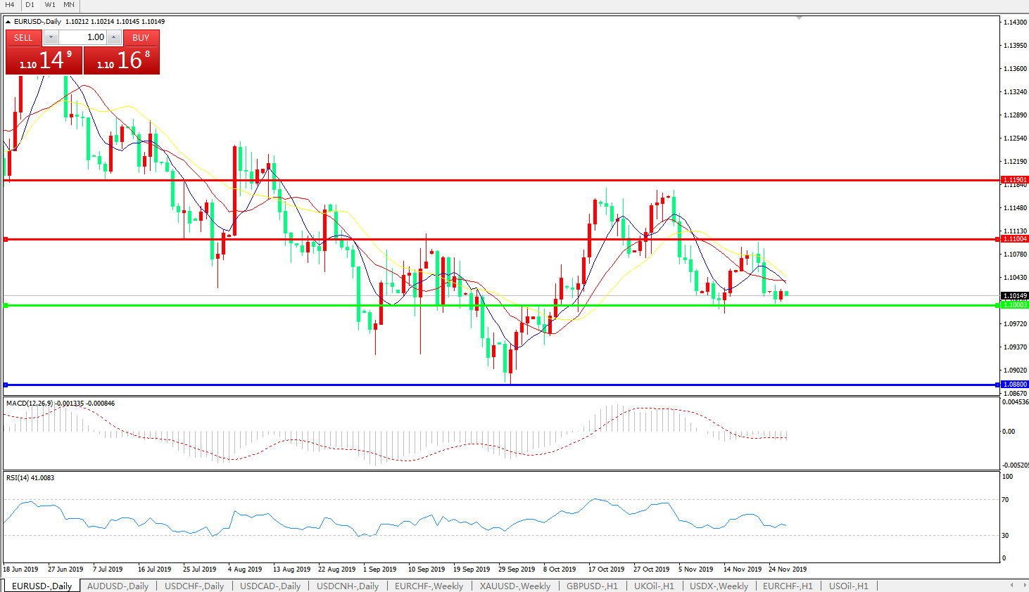 技术面简析:日图均线再度呈空头排列,汇价1.10关口整理徘徊,MACD量能在0轴下方有再度放量的迹象 ,RSI持续走弱,预计汇价短期汇价将延续整理态势,关注1.1000关口争夺。
