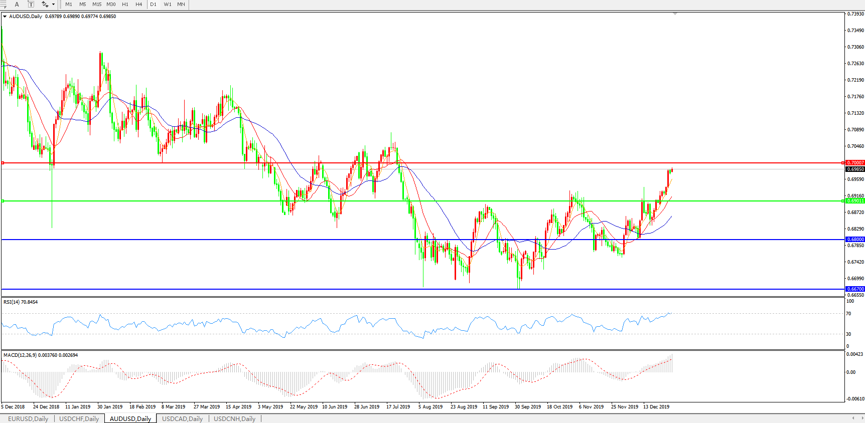 技术面简析:日图均线整体呈多头排列,汇价持续大幅度上攻,MACD继续上攻且量能维持放量,RSI震荡走高进入超卖区域,短线关注0.70关口的压制,预计汇价大概率将进一步走高。