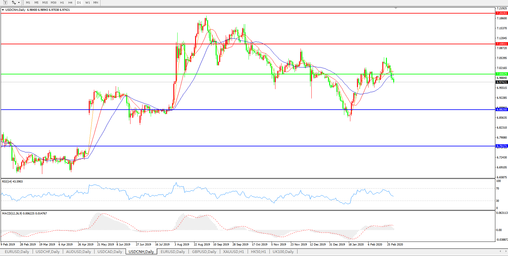 交易策略: 在7.0000之下,看跌,目标价位为6.8820,然后为6.7600。