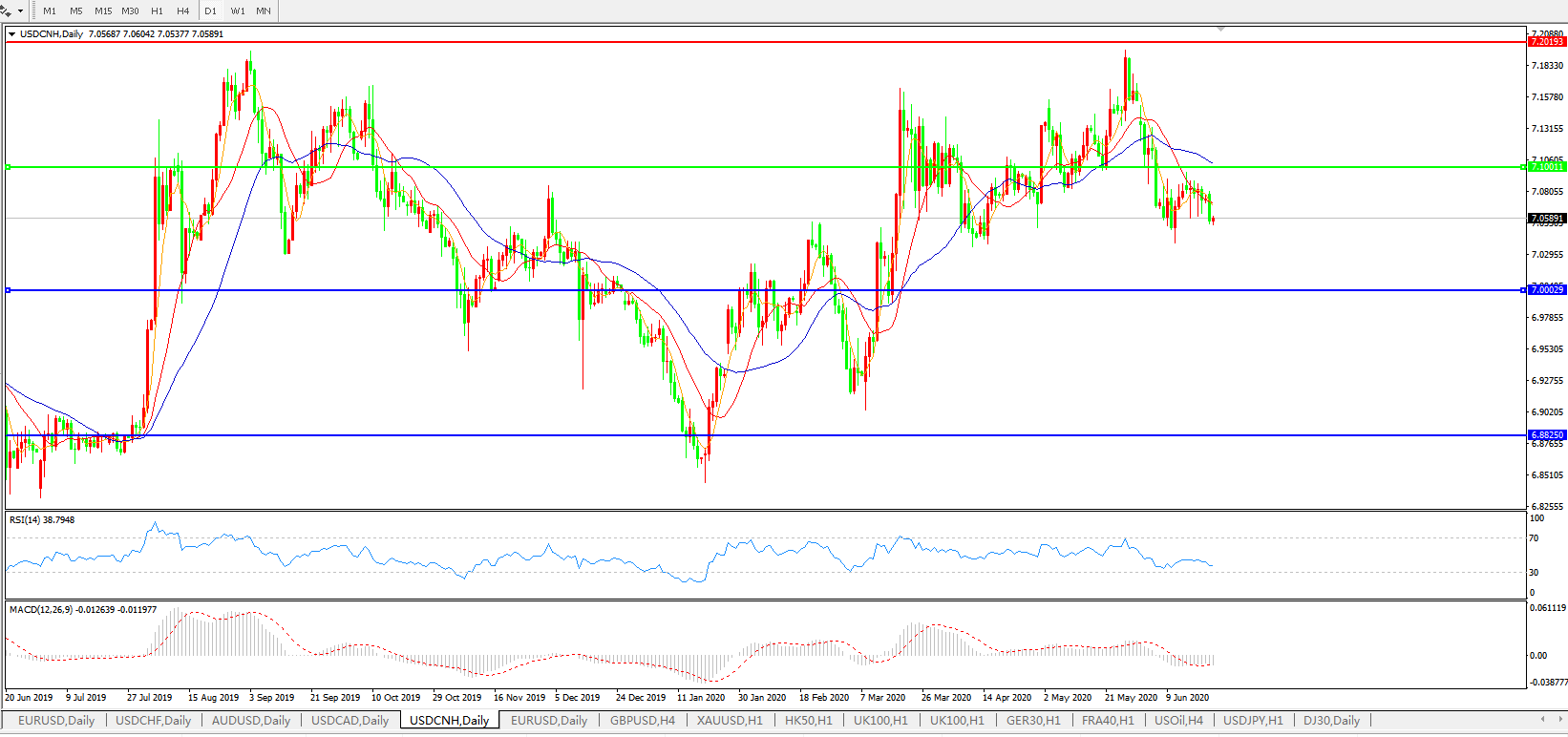 技术面简析:日图均线呈有序空头排列,汇价7.10关口下方窄幅整理,MACD下穿0轴但量能0轴下小幅缩量,RSI有走升迹象,预计短期汇价或将进一步上行,关注7.10关口压制。
