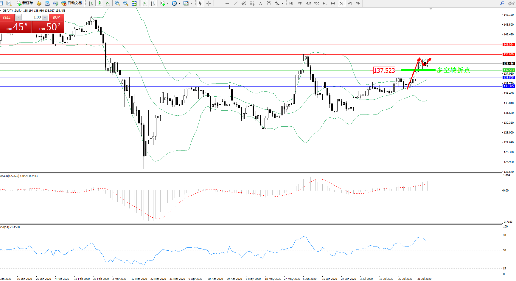英镑兑日圆持续高位震荡于138.456附近,英国央行货币政策委员会将于周四(8月6日)公布8月利率决议,预计将基准利率维持在0.10%不变,资产负债表仍是英国央行选择的政策工具,今年秋季采取行动的压力将加大,尽管预计该央行继续将资产负债表视为选择的政策工具,但购买放缓意味着进一步上调资产购买规模上限不会马上出现,由于货币政策委员会希望尽可能长时间地保持它的“弹药”,预计货币政策声明不会有任何大胆的声明或进一步放松的强烈暗示;风险显然倾向于进一步放松货币政策,而不是收紧政策立场,这是货币政策委员会何时宣布新措施的问题,而不是是否宣布新措施的问题;年内剩余时间英国经济将面临三重风险,新冠病毒疫情的第二波爆发,英国脱欧协商以及失业率上升,预计英国央行将在11月利率决议上把资产购买规模再增加1000亿英镑。