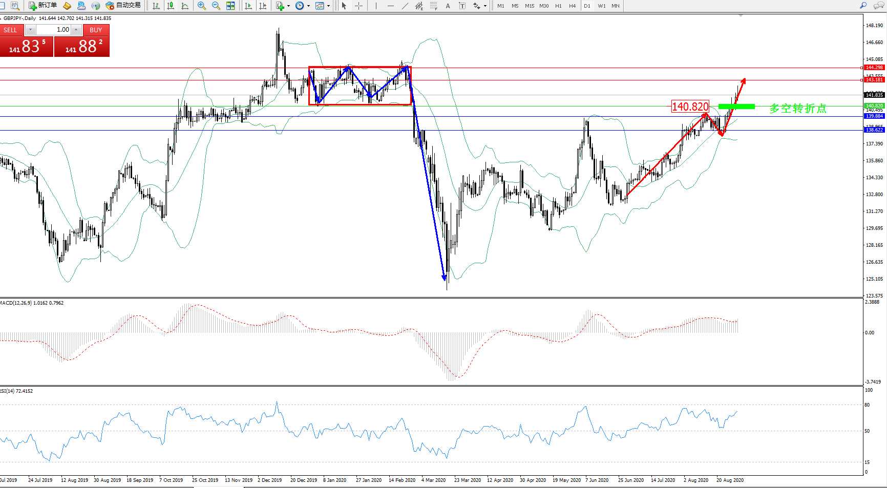 交易策略:140.820上方看涨,目标143.181、144.298