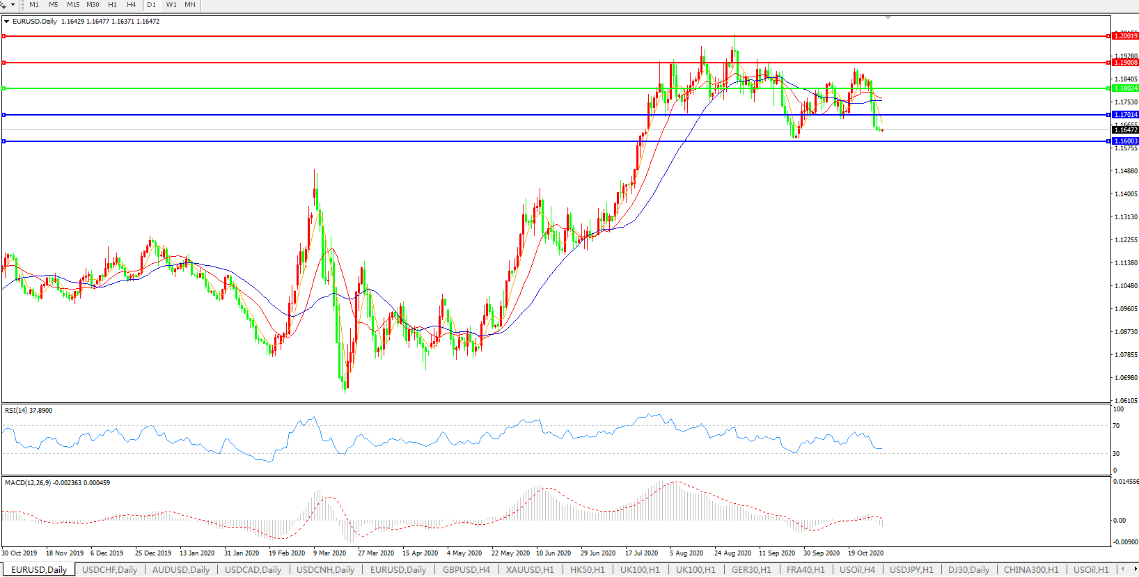 欧元兑美元在周五日内反攻1.17关口失利,表现仍然疲软;虽然日内欧元区GDP数据显示各国经济在三季度都录得恢复性增长,但眼下重新开始的新一轮封锁却令这一系列数据变得毫无意义,经济前景仍然低迷且困境重重,这使得欧元日内继续跑输多数G10货币;而与此同时,美国大选选情的不确定性还带来着额外的顾虑,这虽然暂时遏制了美元指数升幅,令欧元汇价不至于立即破位,但欧元后市走势前景却仍然悲观。一旦下周美国大选尘埃落定,欧洲市场风险继续的状况将推动美元指数报复性上升,从而推动欧系货币进一步下探,失守前低1.1612将意味着通往1.15关口的下跌通道被进一步打开。