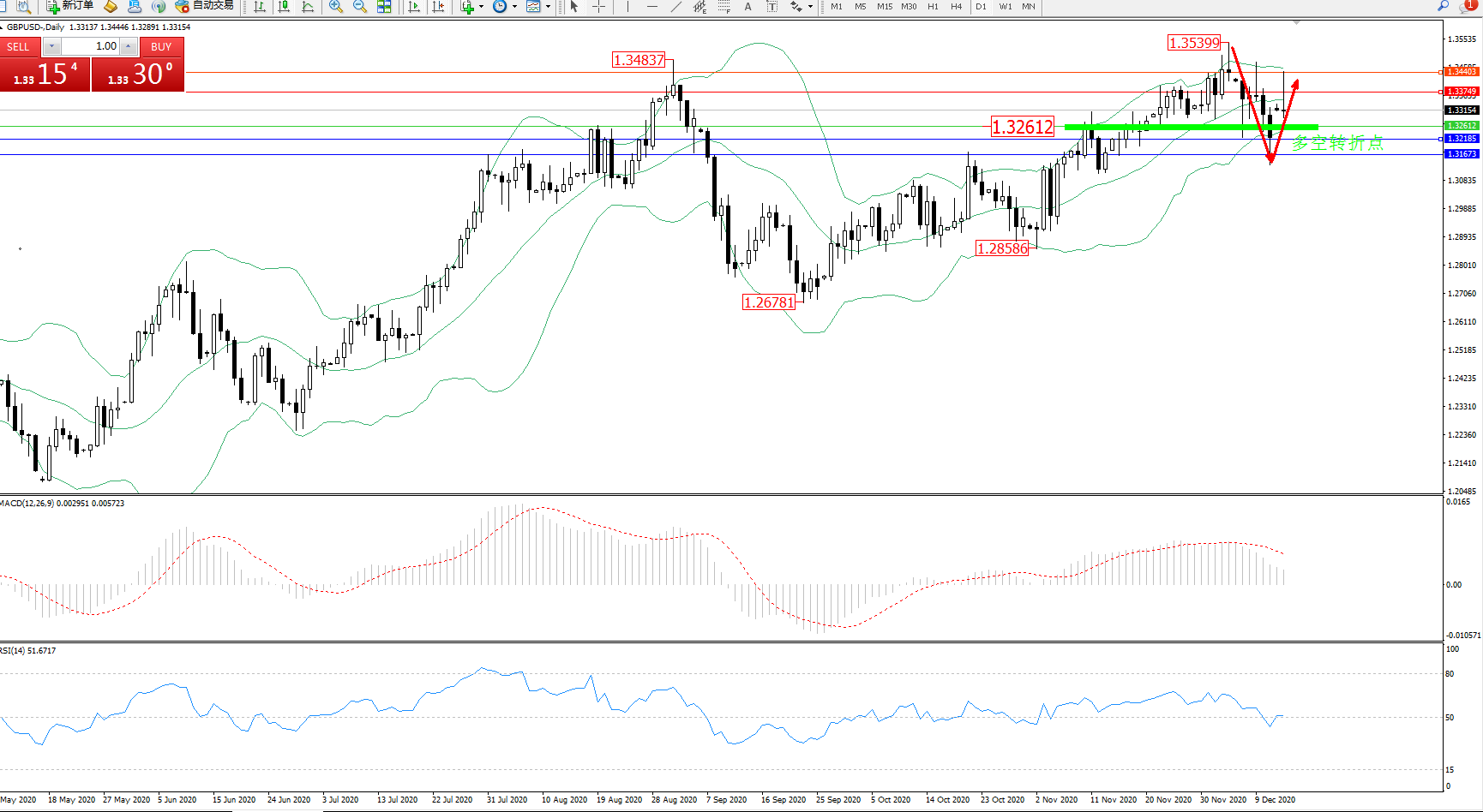 交易策略:1.32612上方看涨,目标1.33749、1.34403