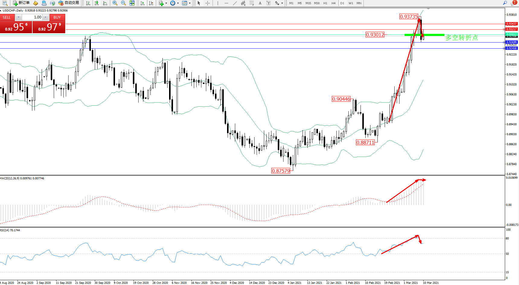 技术点评:多头动力延续布林带指标上轨附近节点持续震荡上扬,高位抵达0.93735位置后遇阻急速回撤下行,布林带指标呈张口走势后下轨附近节点有短暂收口迹象,短期回撤至前期高位附近震荡中,但继续移动趋势尚未有完全止步迹象,MACD指标处于多头区域维持震荡持续向上移动中,RSI指标处于多头区域维持震荡上移至超买区80均衡线附近节点整理后反转震荡;
