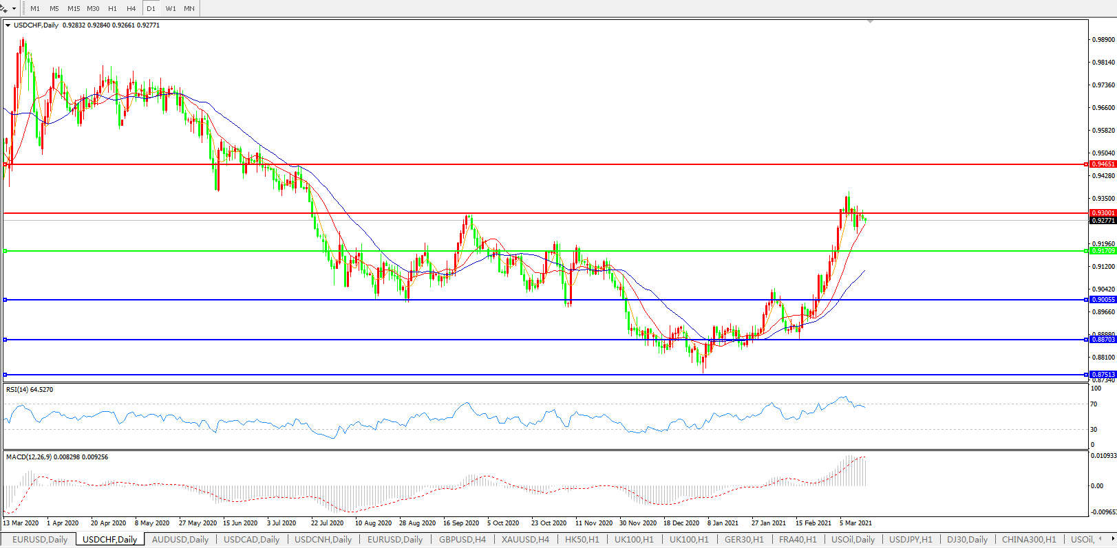 技术面简析:日线图均线整体呈上攻走势,汇价飙升后窄幅整理蓄势,MACD运行于0轴上但量能0轴上小幅缩量,RSI超卖区域开始走软,预计短期汇价大概率将进一步上行。