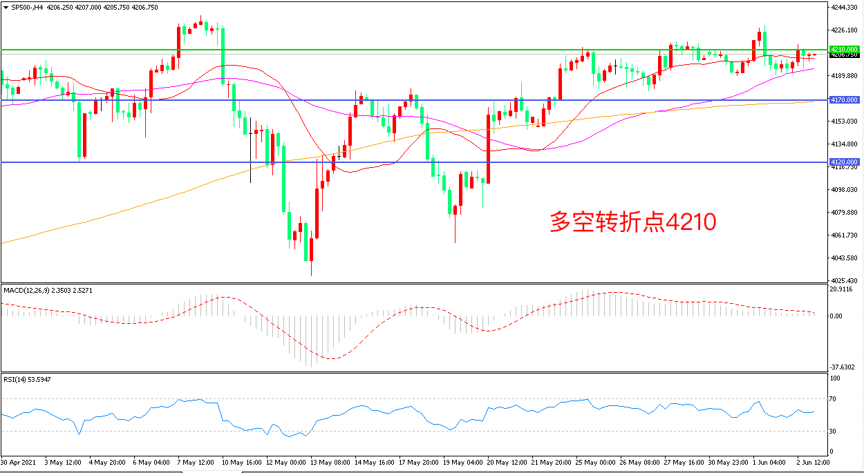4小时图看,标普500呈现区间震荡形态,4210成为短期多空分水岭,55周期均线成为短期支撑,MACD红柱缩短,RSI指标走平,日内震荡上行概率较大。
