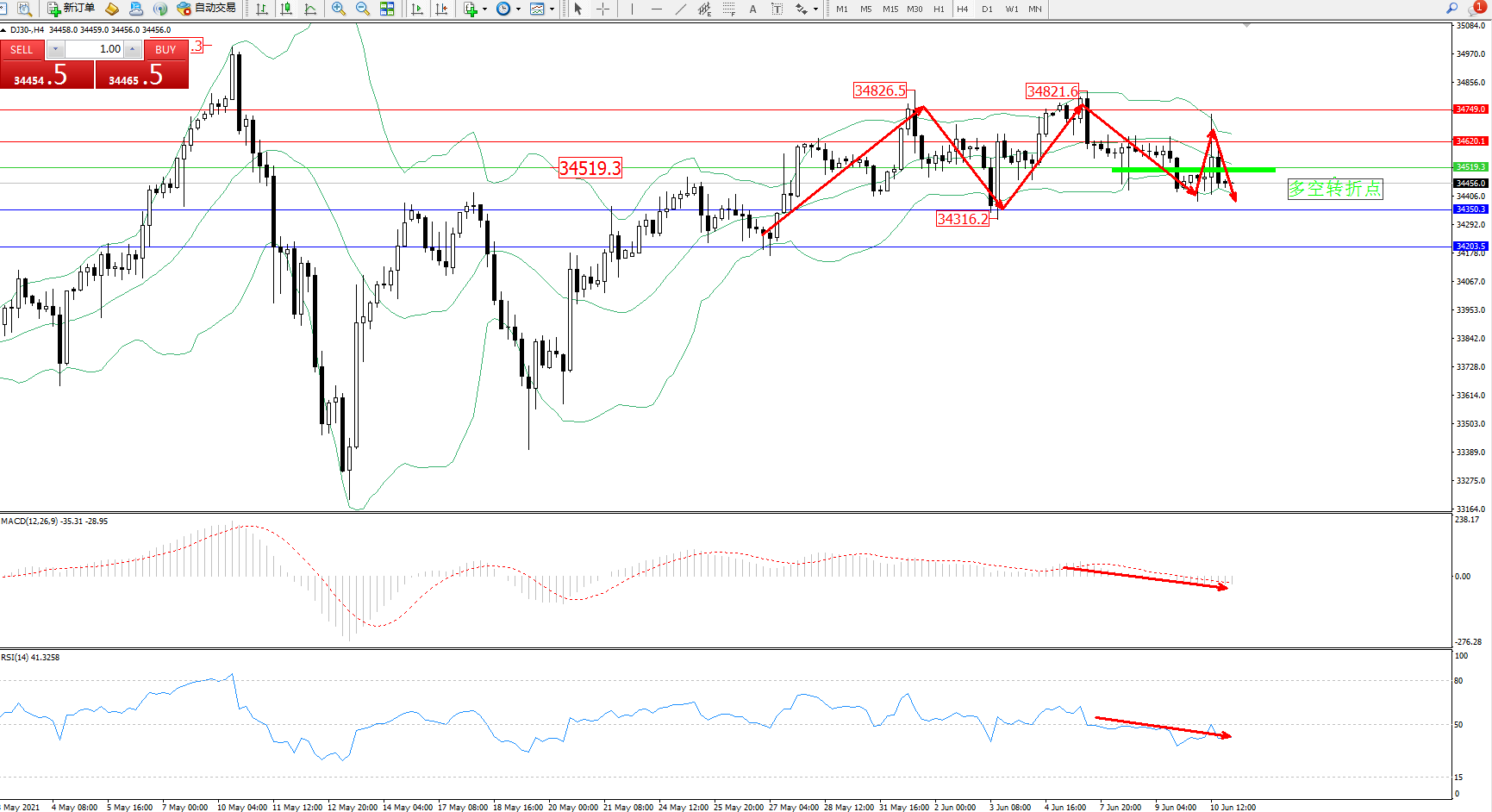 交易策略:34519下方看跌,目标34350、34203