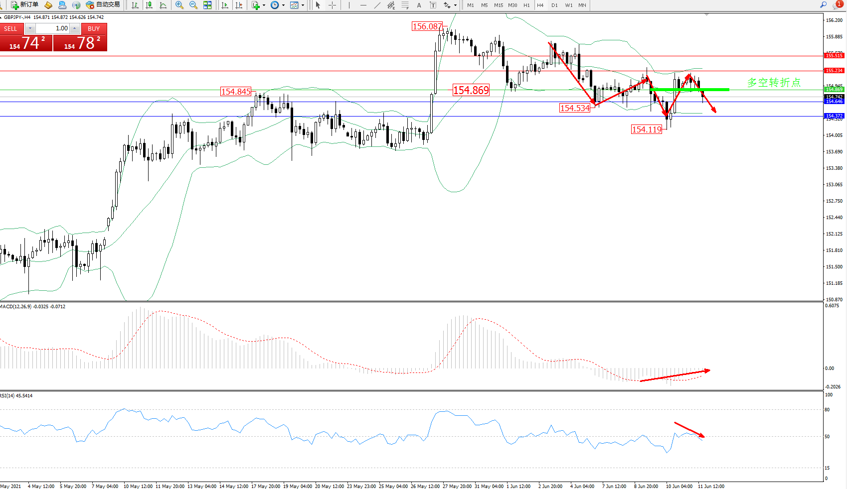 交易策略:154.869下方看跌,目标154.646、154.372