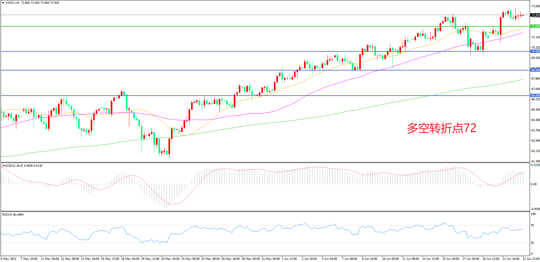 4小时图看,油价长阳拉升,强势突破72美元阻力,短期表现强势,均线系统成为下方支撑,MACD红柱增加,RSI指标走平,日内震荡上行概率较大。