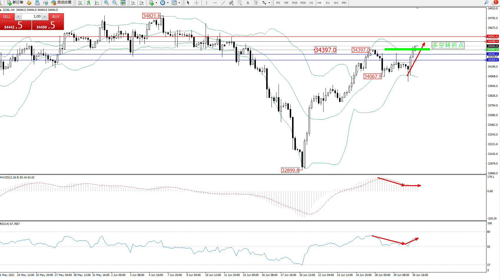 交易策略:34397上方看涨,目标34499、34561