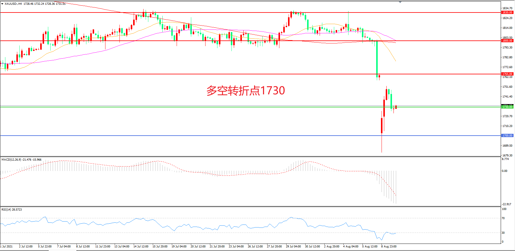 周一(8月9日),强劲的美国就业数据提振对美联储将提早缩减经济支持措施的预期,金价开盘跳空低开,陷入剧烈震荡,日内回补日内多数跌势后再度下行,收报1730美元/盎司。投资者现在将把注意力转向本周晚些时候发布的美国通胀数据,然后是本月晚些时候美联储官员在杰克逊霍尔会议上发出的政策信号,如果美联储继续坚持“鹰派”表态,金价会再度迎来下行。