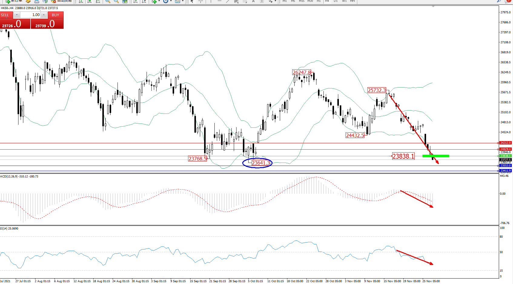 技术点评:空头动力延续布林带指标通道下轨附近持续震荡下行,短期跌势未见止步迹象,前期低位23641位置近在咫尺破位在即,布林带指标呈张口走势态势良好,MACD指标空头动力维持震荡下行态势良好,RSI指标处于空头区域维持震荡持续下探;