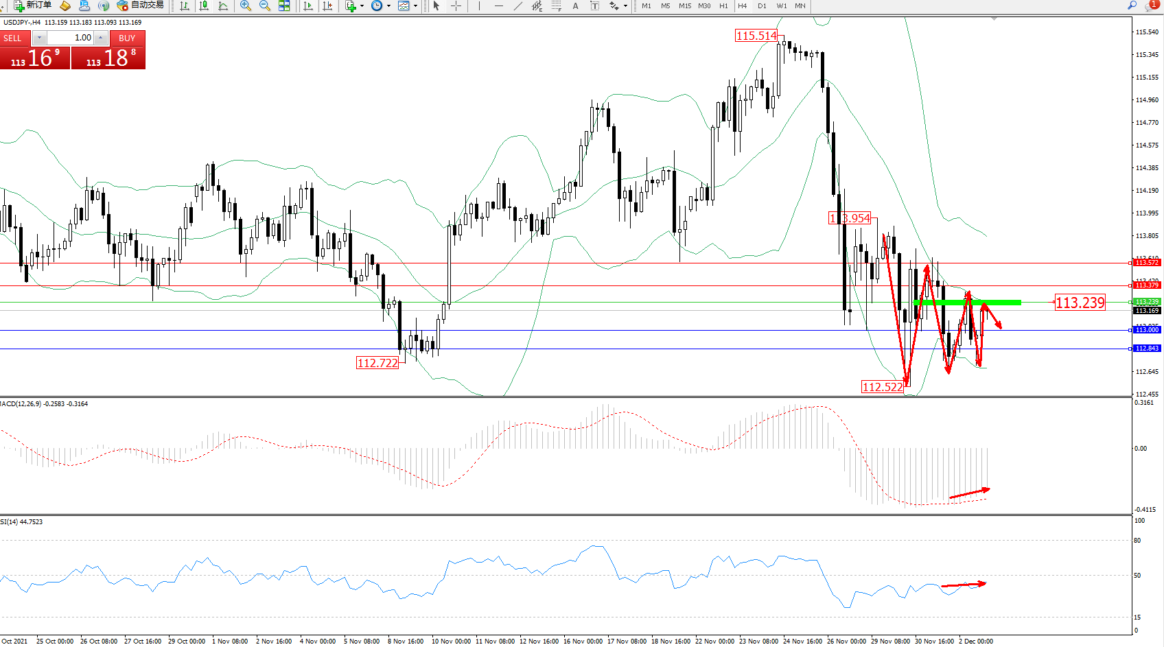 交易策略:113.239下方看跌,目标113.000、112.843