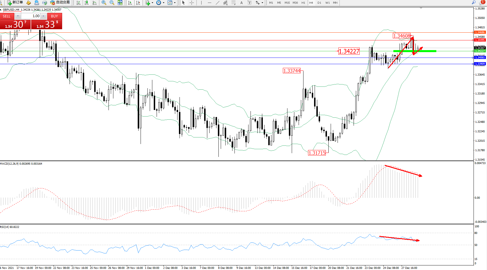 交易策略:1.34227上方看涨,目标1.34495、1.34686