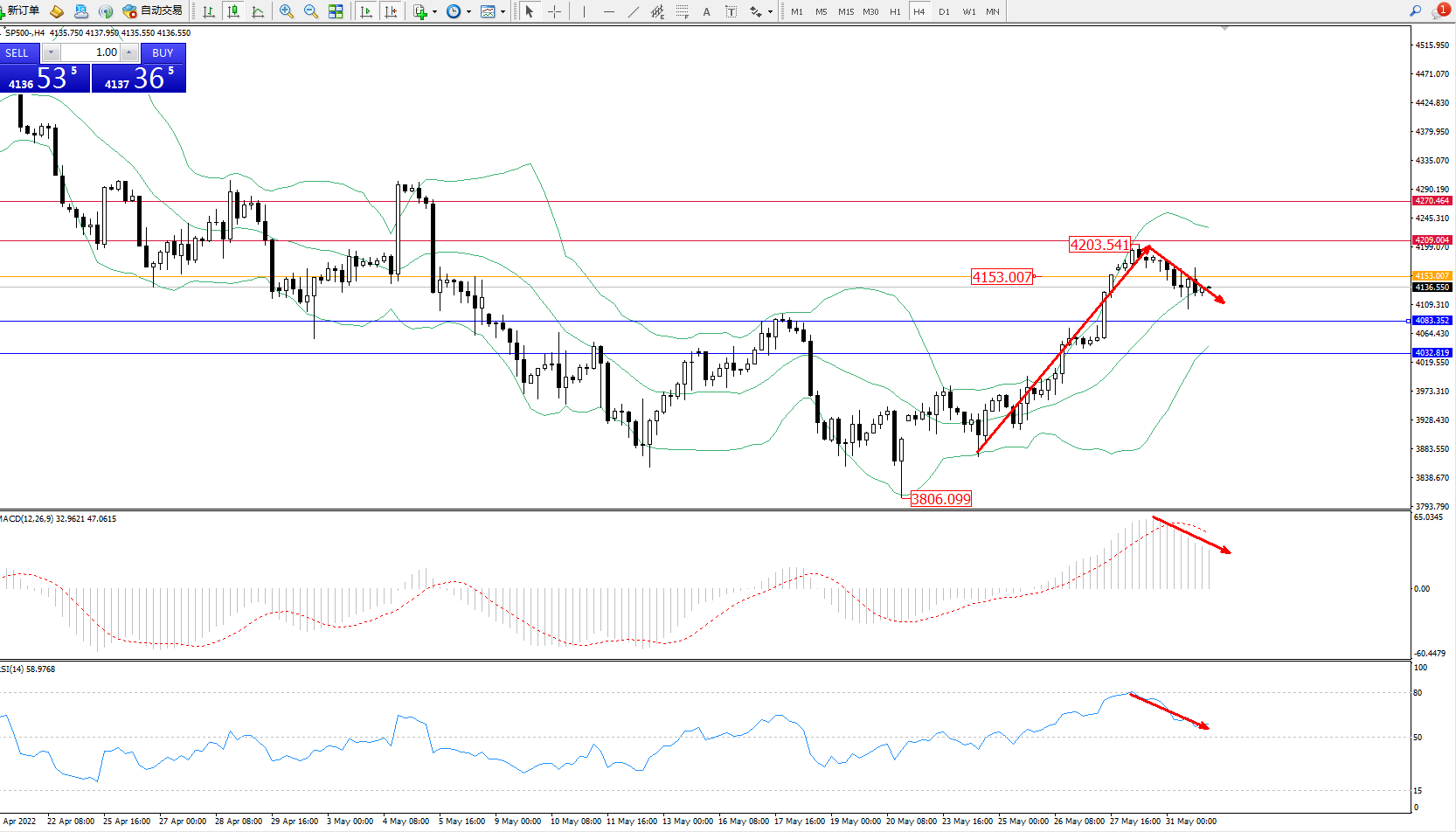 标普SP500——4小时K线图显示: