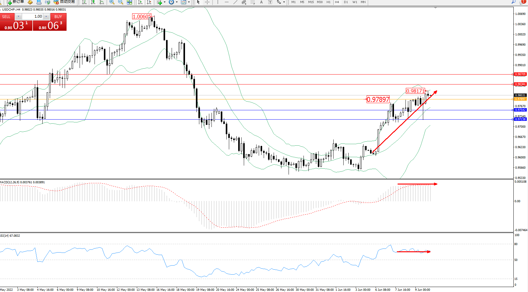 交易策略:0.97897上方看涨,目标0.98384、0.98709