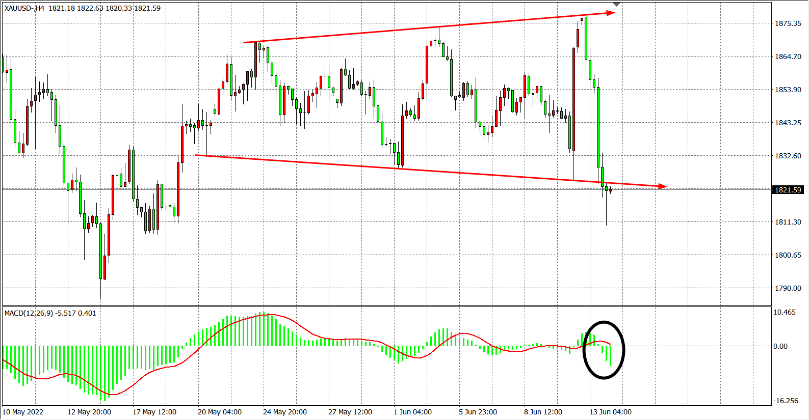4小时图看,金价持续喇叭形宽幅震荡,昨日大跌已把前一个交易日的涨幅全部吞没,空头占据主导,MACD显示主柱体在零轴之下急剧放量,显示空头力度强劲,日内延续继续下跌概率及较大