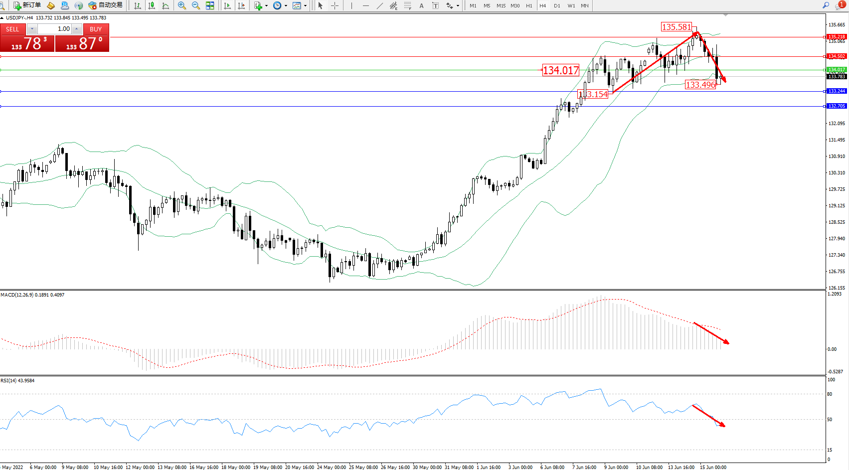 交易策略:134.017下方看跌,目标133.244、132.705