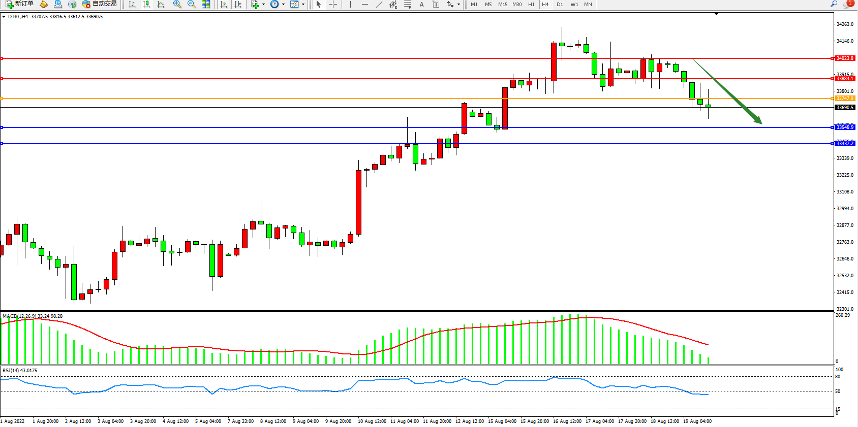 道琼斯指数DJ30——4小时K线图显示: