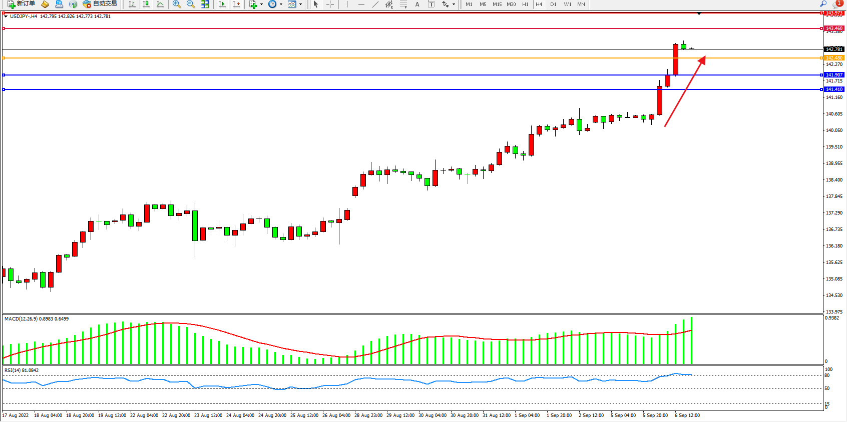 交易策略:142.480上方看涨,目标143.460、143.973