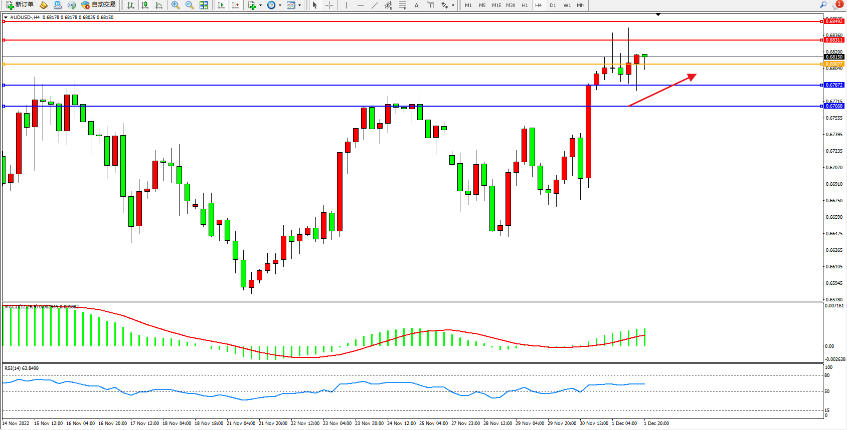 交易策略:0.68077上方看涨,目标0.67311、0.68492