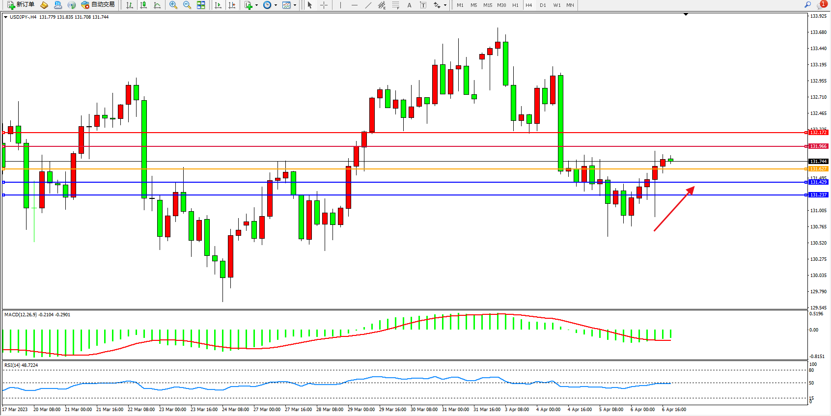 4小时图看:多头动力维持震荡上移,短期看涨情绪涌现,市场多头动力不断向上拉升中,MACD指标处于0轴线下侧整理,RSI指标处于50均衡线附近弱势徘徊中;