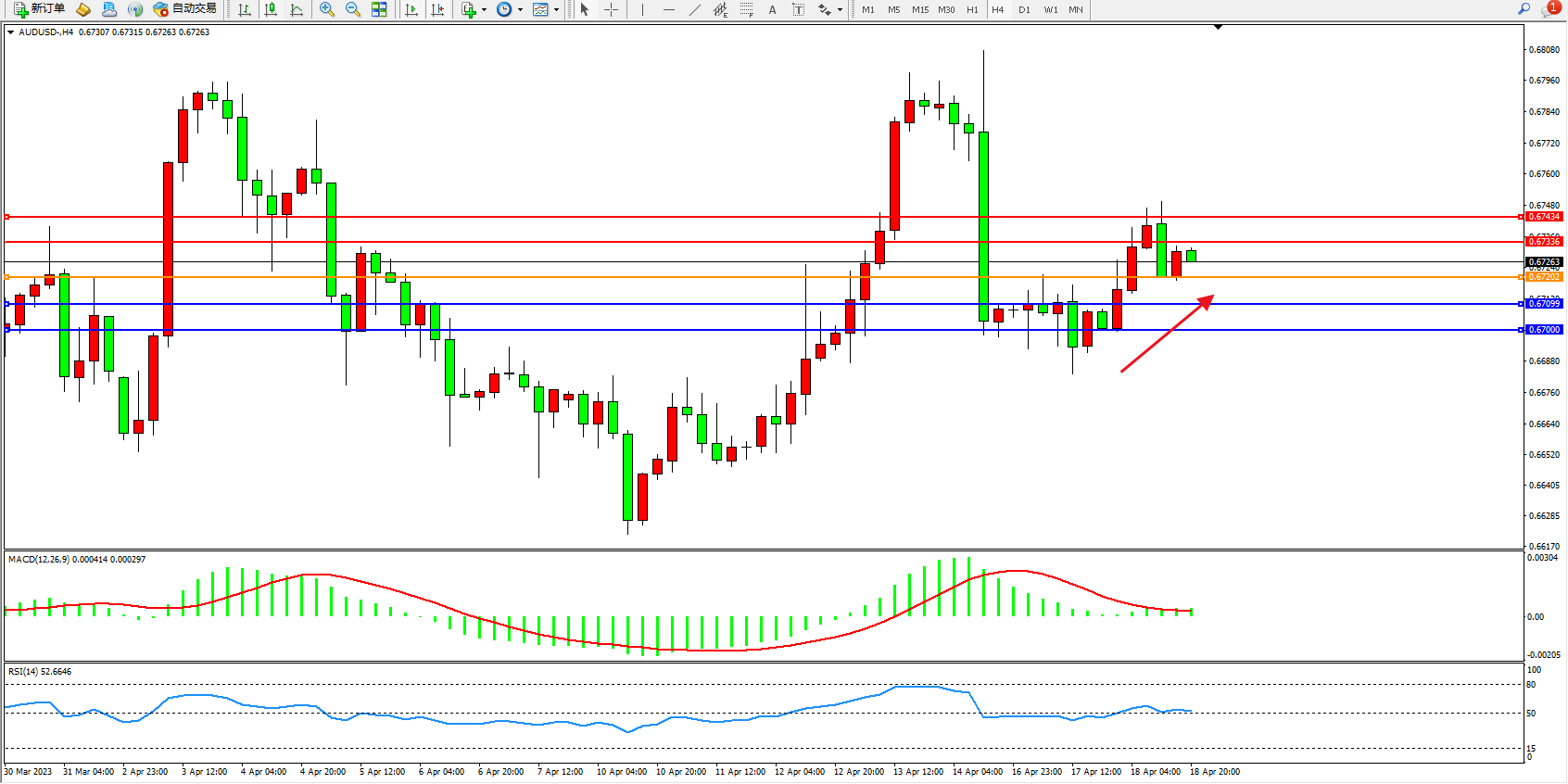 交易策略:0.67202上方看涨,目标0.67336 0.67434