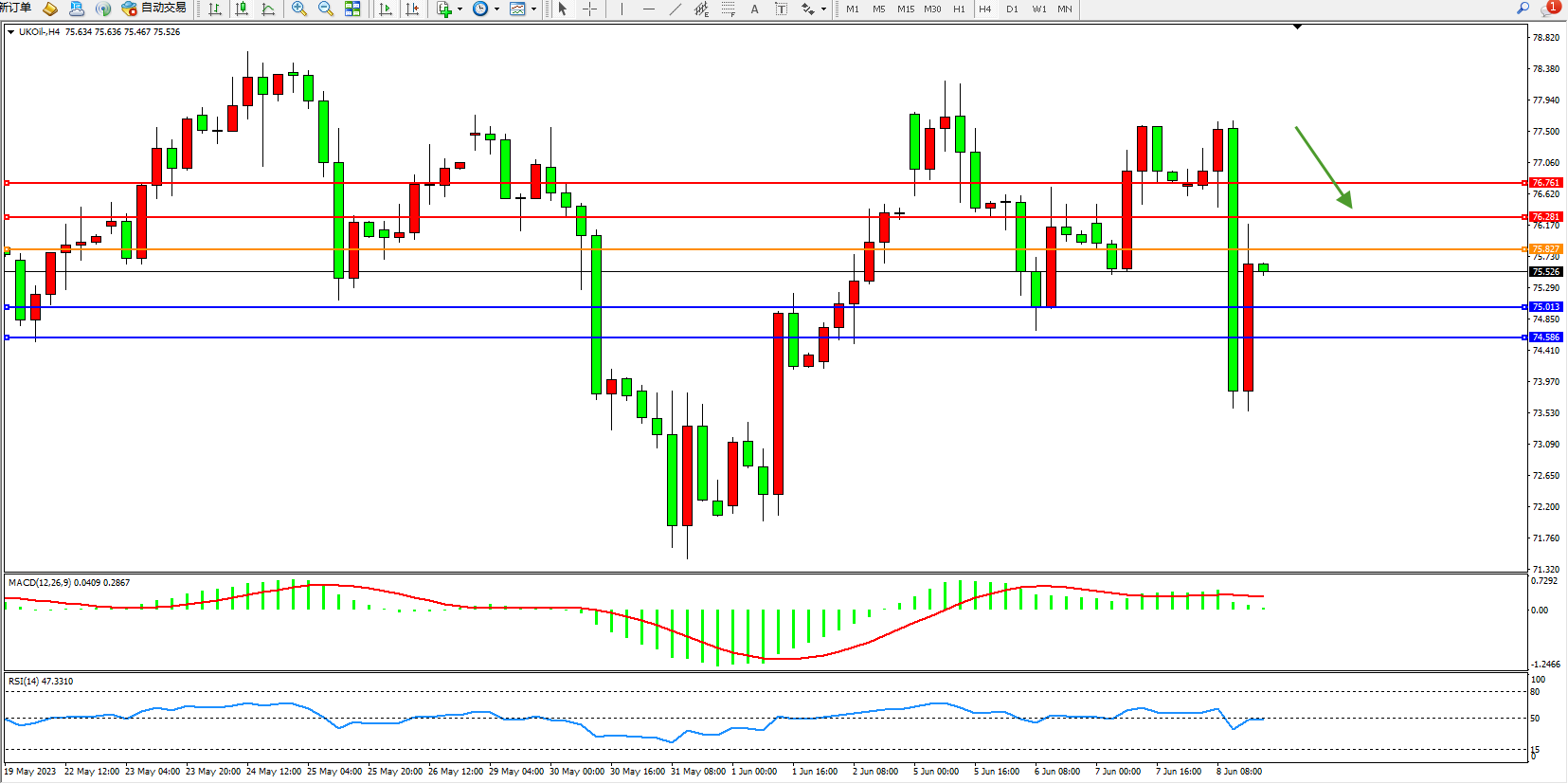 交易策略:75.827下方看跌,目标75.013 74.586