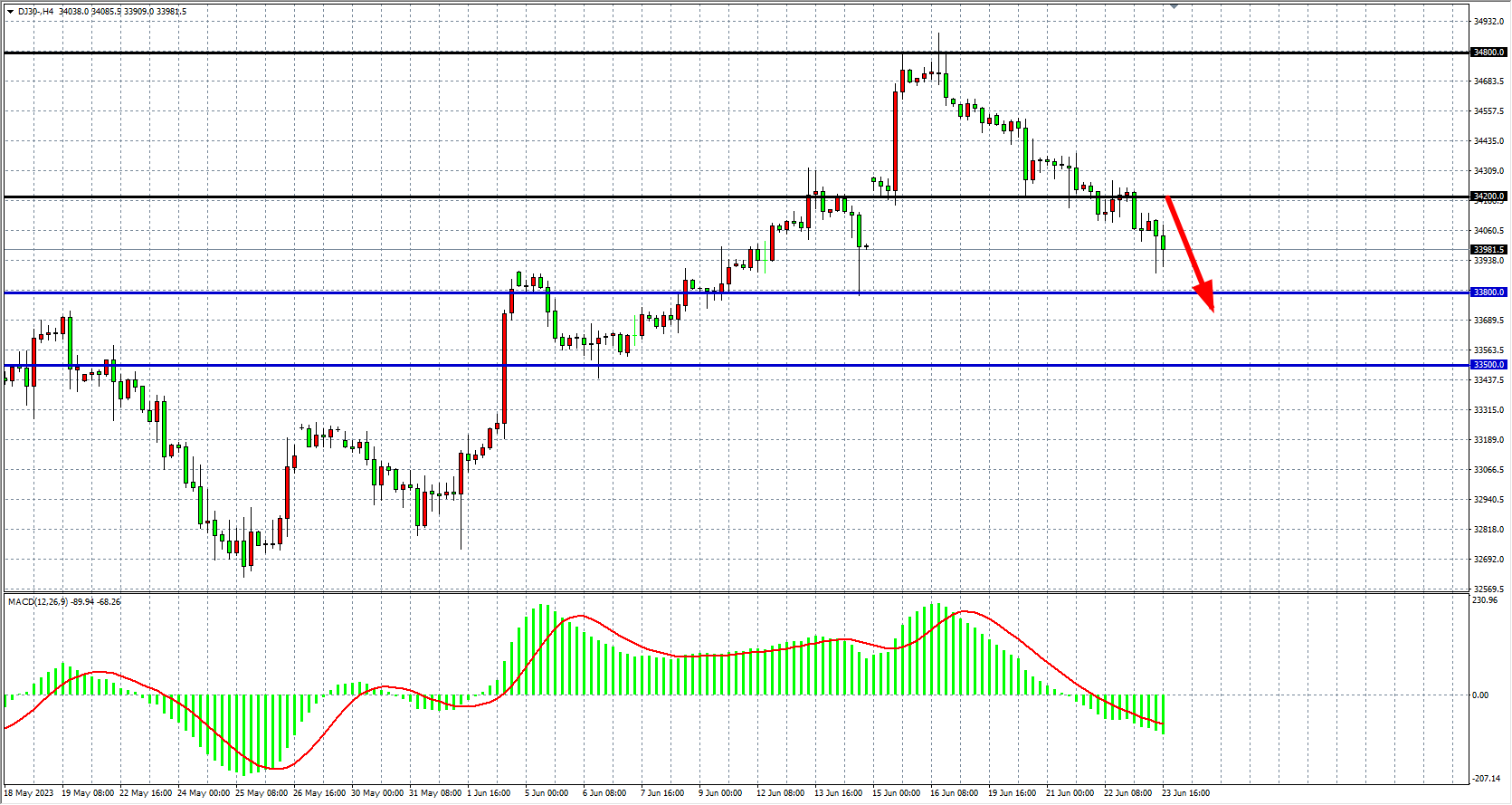 交易策略:34200 下方看跌,目标 33800 33500