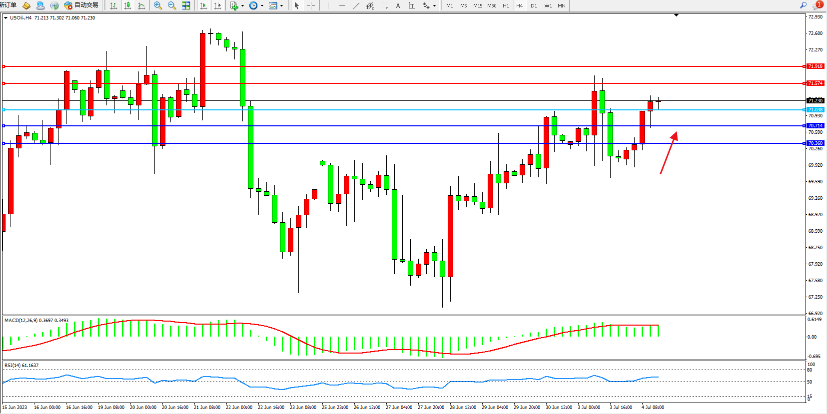 交易策略:71.038上方看涨,目标71.574  71.918