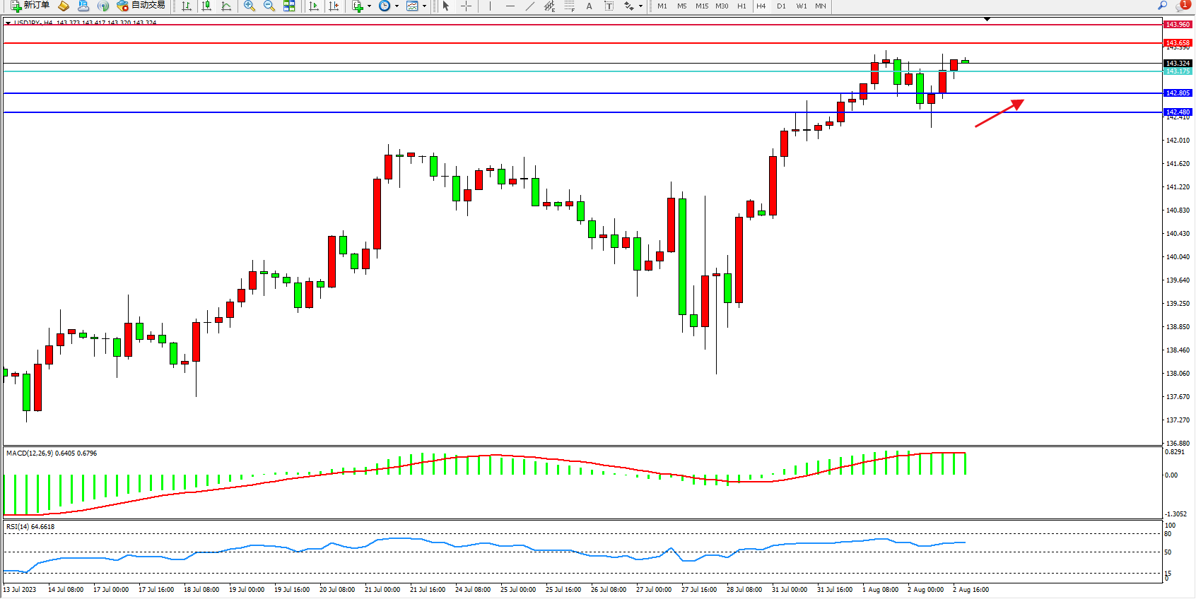 4小时图看:高位短期维持整理,市场多头情绪笼罩,短期有继续震荡向上移动迹象,MACD指标处于多头区域高位整理,RSI指标处于多头区域维持徘徊;