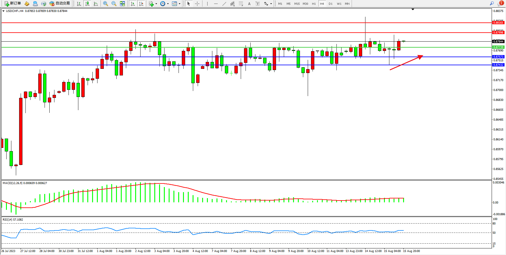 美元瑞郎USDCHF——4小时K线图显示: