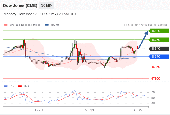 在 48370 之上,看涨,目标价位为 48730 ,然后为 48920 。