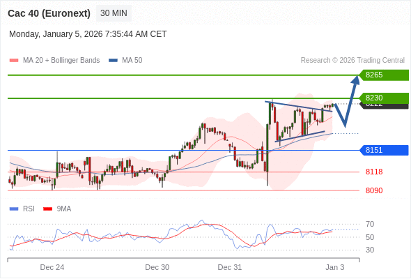 法国CAC指数期货 (Euronext) (F6) 当日内: 在8151之上,看涨。